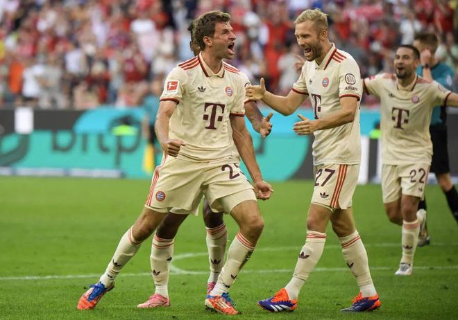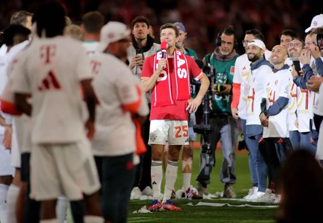 四月初,拜仁官方发布公告称,穆勒在2024-25赛季结束后将离开俱乐部。在确认提前问鼎德甲后,穆勒在联赛倒数第二轮对阵门兴格拉德巴赫的比赛中迎来了自己的主场告别战。在赛后颁奖仪式上,安联球场的草坪上摆放着三个巨幅圆形画布:德甲冠军沙拉盘、拜仁慕尼黑队徽和穆勒的25号。“我会怀念这一切,但看着现在的球队,有那么多充满饥饿感的年轻人。正如你们所说,他们愿为拜仁倾尽所有,所以我对未来充满信心。不过我要请每一位在未来几年全力以赴,这是比个人理想更伟大的事业!”穆勒的告别演讲情真意切,令人动容、令人不舍。