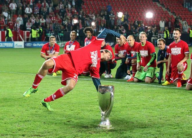 欧洲超级杯对垒切尔西,两队鏖战120分钟难分胜负,最终点球大战拜仁五罚全中,蓝军卢卡库失点,瓜迪奥拉收获了入主拜仁后的首个冠军。成功“复仇”切尔西后,穆勒在庆祝中展示了自己的“柔韧性”,奖杯旁的翻跟头庆祝逗得队友和球迷们都非常开心。