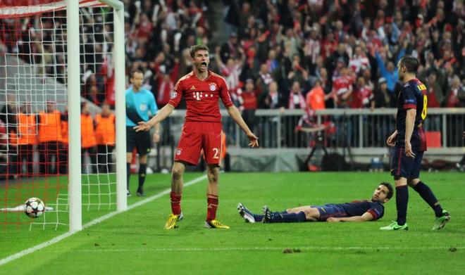 如果说2011-12赛季对于穆勒和拜仁来说是苦涩的,那么他们并没有让胜利的喜悦等待太久。海因克斯治下的拜仁在各条战线上高歌猛进,截至半决赛,穆勒已经在本赛季欧冠打进5球,而对阵巴萨的两回合比赛则完全成了他的表演。首回合在安联,穆勒头球破门首开纪录,随后下半场助攻戈麦斯得分,终场前他完成梅开二度,将比分定格为4比0;次回合在诺坎普,穆勒的拜仁毫不客气地3比0完胜对手,最终总比分7比0昂首晋级欧冠决赛。