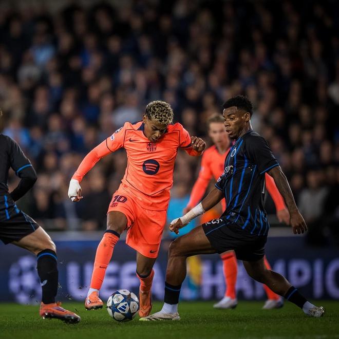 易边再战,第61分钟,场上迎来精彩配合,亚马尔在弧顶外得球后突破重围,与费尔明完成撞墙配合,接到后者回做后,禁区内外脚背低射远角破门,巴萨2-2再度扳平比分。第64分钟,瓦纳肯断球后送出精准斜塞,博尔赫斯再次前插获得单刀机会,以一记轻巧的挑射攻破什琴斯尼的十指关,完成梅开二度的同时,帮助布鲁日3-2第三次取得领先。