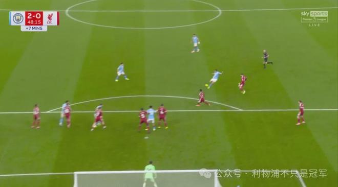 曼城27分50秒左右反击到利物浦左路,由于盯防切尔基的罗伯逊被拉到中路,而曼城攻击到利物浦左路时,左中卫范迪克被迫补防到左后卫位置,这是曼城本场针对利物浦的战术之一,就是要让范迪克离开利物浦中路!
