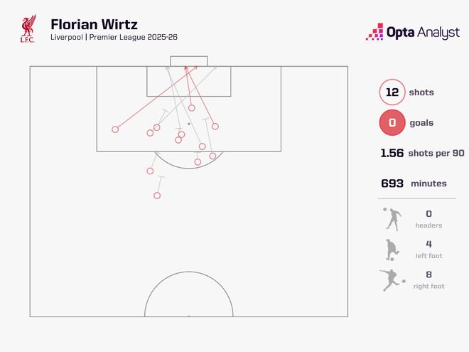 据统计,维尔茨已经在英超完成12次射门,但未取得进球,这名德国球星还创造出16次机会,但也没有取得助攻。